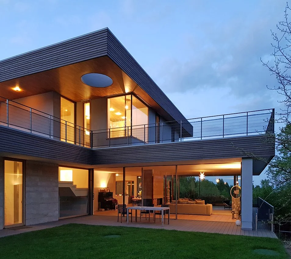 Unsere Bauherren wünschten sich gestalterisch explizit ein Haus „in der Tradition der Moderne“, luftig, transparent und mit sinnlich spürbaren Materialien. Gleichzeitig sollte aber die Umsetzung unserem heutigen Wissen über Nachhaltigkeit und erneuerbarer Energie entsprechen.